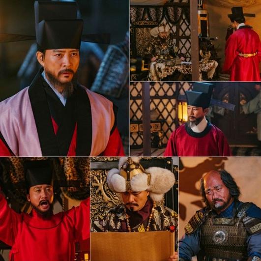 그런 가운데 오늘(8일) 공개된 스틸 속 비장한 심정으로 거란군 군영에 도착한 강감찬의 모습이 담겨 있다. 개경에서 보낸 표문을 살펴보던 야율융서는 친조를 허락하면 현종이 신하로서 발아래 엎드릴 것이라는 강감찬의 말에 흡족한 표정을 지어 보인다.