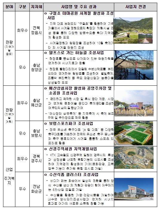 (최우수 사례) 지역개발공모 분야는 사업 추진경과 및 사업효과에서 높은 점수를 받은 정읍시 ‘구절초 테마공원 사계절 활성화 조성사업’이 지역개발계획 분야는 지역축제 및 청년 창업점포 공간 활용도가 우수한 예산군 ‘예산상설시장 활성화 공영주차장 및 소공원 조성사업’이 산업?주거복지 분야에서는 지역경제 파급효과에서 좋은 평가를 받은 경주시 ‘신경주역세권 지역개발사업’이 각각 선정됐다.