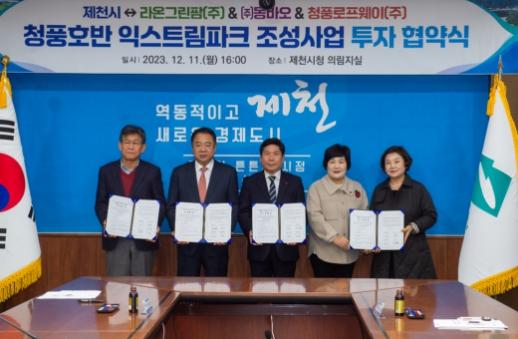 11일 제천시청 의림지실에서 김창규 시장, 이정임 제천시의회 의장과 투자자인 농업회사법인 라온그린팜(주), ㈜동바오, 청풍로프웨이(주) 대표이사들 등 관계자들이 참석한 가운데 청풍호반 익스트림파크 조성사업의 성공적인 추진을 위한 투자협약을 체결했다.