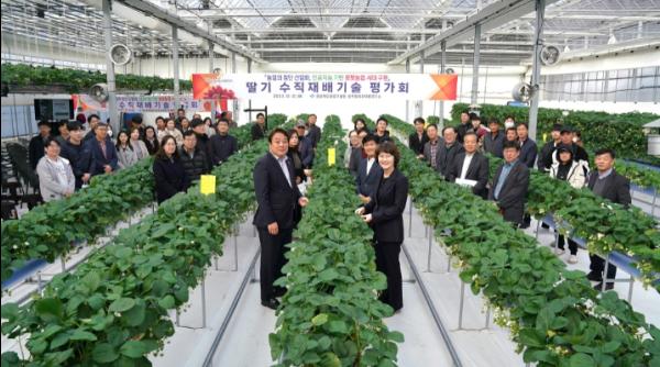 이날 평가회에서는 미래 노동력 감소에 대비하기 위해 연구 중인 로봇 수확과 병해충 방제를 위한 딸기 재배용 로봇 연구 소개 및 생육모니터링 시연도 진행했다.
