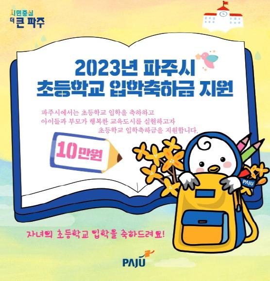 ‘파주시 초등학교 입학축하금’은 민선8기 공약사업으로, 시는 지난 2월 '파주시 초등학교 입학축하금 지원 조례'를 제정해 지원 근거를 마련하고 제2회 추경 예산에서 5억 5천만 원을 확보하여, 5월 1일부터 11월 30일까지 온라인 및 방문 신청을 받았다.
