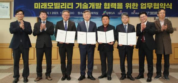 전북도가 13일 도청 회의실에서 김관영 전북도지사를 비롯해 김종현 KGM커머셜 대표이사, 조영욱 KG S&C 대표이사, 이항구 자동차융합기술원장 등이 참석한 가운데 전라북도?KGM커머셜?KG S&C?자동차융합기술원 간의 미래모빌리티 기술개발 협력을 위한 업무협약을 체결했다고 밝혔다.