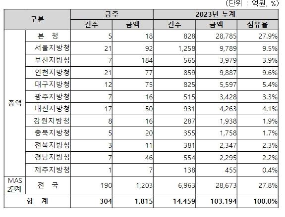 지역별 발주량을 보면, 총액계약 대상 612억 원 중 본청이 18억 원으로 2.9%를 집행하고 서울청 등 11개 지방청에서 594억 원을 각각 집행할 예정이다.