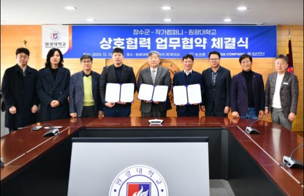 장수군은 13일 원광대학교에서 원광대학교, ㈜작가컴퍼니와 함께 ‘웹소설 콘텐츠 거점조성’ 업무협약을 맺고, 원광대와는 ‘농생명·바이오 사업 및 지역발전방안 연구협력분야’ 협약도 동시에 체결했다.