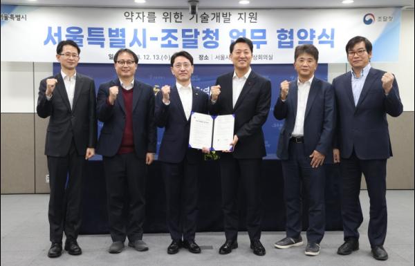 조달청과 서울시는 13일 시울시청 영상회의실에서 ‘약자를 위한 기술개발 업무협약(MOU)’을 체결했다.