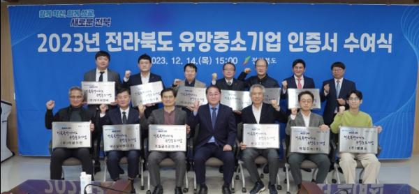 전북도는 14일 전라북도경제통상진흥원에서 12개 전라북도 유망중소기업에 인증서와 인증현판을 수여했다.