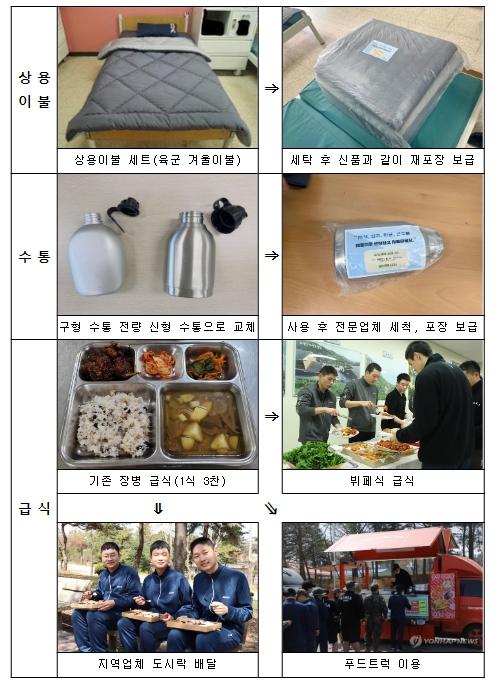 뻣뻣한 모포 대신 뽀송뽀송한 엄마표 집 이불 덮게 하고,관리 힘든 구형 수통 대신 스테인리스 ‘밀리터리 텀블러’ ( 신형 수통 ) 지급