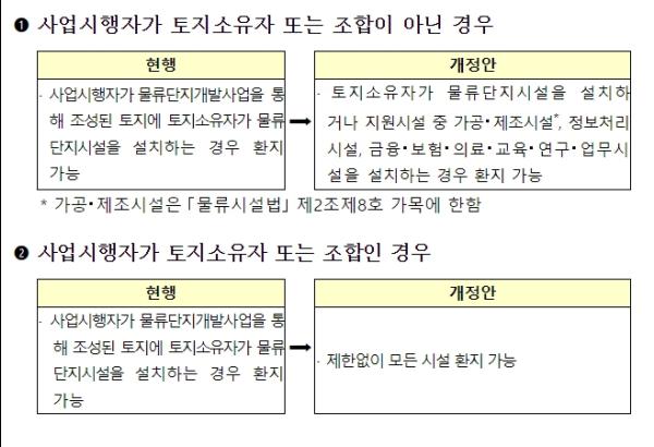 이번 개정안에는 토지소유자 또는 조합이 아닌자가 사업을 시행하는 경우 토지소유자가 물류단지개발로 조성된 토지에 가공?제조시설, 정보처리시설, 금융?보험?의료?교육?연구?업무시설을 설치하려는 경우에도 환지를 허용하고,