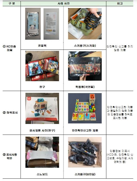 적발 제품으로는 △완구(눈썰매, 스노우튜브, 보드게임 등 약 30만 개)가 가장 많았으며, △가스라이터(약 6.2만 개), △기타 어린이 제품(약 4.2만 개)이 그 뒤를 이었고, 위반 유형은 △KC 안전인증 미획득(약 13만 개), △안전 표시사항 허위기재(약 16만 개), △안전 표시기준 불충족(약 18만 개) 순이었다.