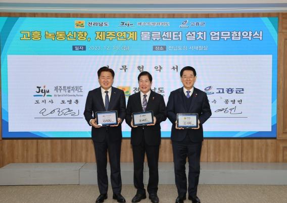 고흥군은 18일 전남도청 서재필실에서 전라남도, 제주특별자치도와 3자 간 녹동신항에 제주 생산품의 내륙 연계 물류거점 조성을 위한 업무협약을 체결했다.
