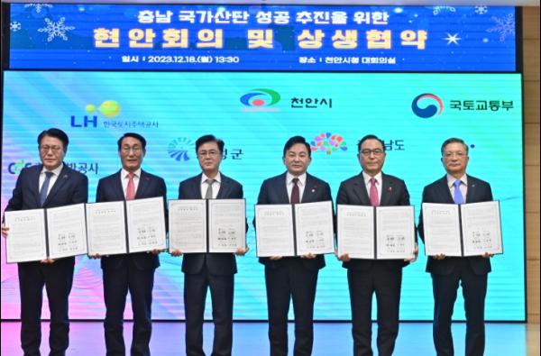 도는 18일 천안시청 대회의실에서 김태흠 지사와 원희룡 국토부 장관을 비롯해 박상돈 천안시장, 이용록 홍성군수, 이한준 한국토지주택공사(LH) 사장, 정석완 충남개발공사 사장 등이 참석한 가운데, 현안회의 및 상생협약식을 개최했다.