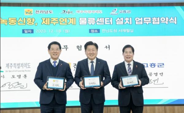 제주도와 전라남도, 고흥군은 18일 오전 11시 전라남도청 서재필실에서 지역의 물류산업 발전과 원활한 물류체계의 효율성을 높이기 위해 업무협약을 체결했다고 밝혔다.