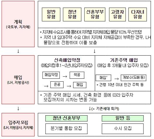 청년 매입임대주택은 시세의 40~50% 수준의 저렴한 임대료로 최대 10년간 거주할 수 있으며, 신혼부부 매입임대주택은 다가구 주택 등에서 시세 30~40%로 거주할 수 있는 ①신혼부부Ⅰ 유형(943호)과 아파트?오피스텔 등에서 시세 60~80%로 거주할 수 있는 ②신혼부부Ⅱ 유형(680호)으로 공급된다.