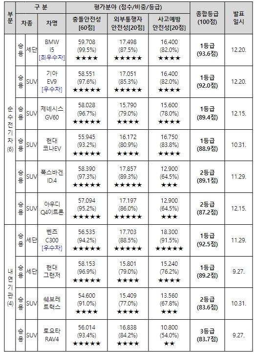 10개 평가 차종 중 BMW i5, 벤츠 C300, 기아 EV9, 제네시스 GV60, 현대 코나EV, 현대 그랜저 등 6개 차종이 3개 평가 분야에서 높은 점수를 얻어 1등급을 획득했다.