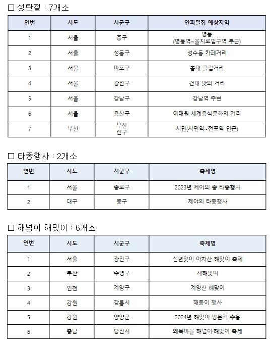 또한, 행정안전부는 연말연시 인파가 집중될 것으로 예상되는 주요 지역 15곳은 행안부 주관으로 관계기관과 함께 현장의 전반적인 안전관리 실태를 집중 점검한다.