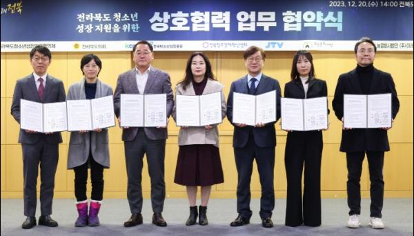 도는 20일 도청 3층 중회의실에서 전라북도청소년성장지원협의체와 최영철 한국탄소산업진흥원 산업진흥본부장, 강영재 전북창조경제혁신센터장, 한명규 JTV 대표 , 김보라 우진문화재단 이사장, 박연미 농업회사법인 (주)이레농원 대표가 참석한 가운데 청소년의 건강한 성장을 도모하기 위해 상호 협력하기로 하고 업무협약을 체결했다.