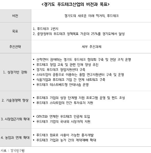 이에 연구원은 경기도가 스타트업 육성 위주의 푸드테크산업 발전 전략을 수립해 국내 푸드테크산업의 발전을 선도할 필요가 있다고 강조했다. 그러면서 ‘경기도의 새로운 미래 먹거리, 푸드테크’를 비전으로 하는 푸드테크 산업의 육성 방향 및 추진 전략을 제시했다.