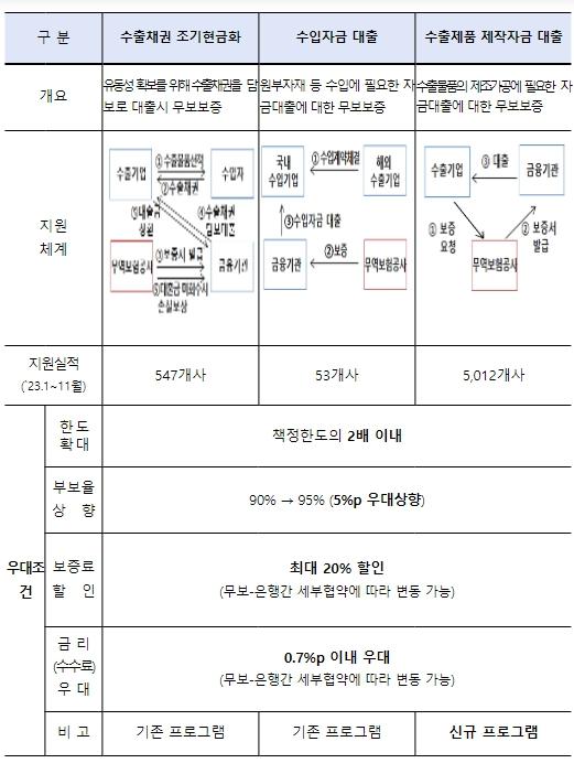 이번에 신설되는 우대상품에는 수출채권 담보 대출, 원부자재 수입자금 대출에 더해 기업들의 수요가 많은 수출물품 제작자금 대출이 포함된다. 은행은 우대상품을 이용하는 고객기업에 대해 대출과 외환 환전 수수료를 우대하고, 무역보험공사는 고객기업이 협약상품 이용 시 보증·보험에 대한 한도 상향(2배 이내), 보증·보험료 할인(최대 20%) 등을 패키지로 지원할 계획이다. 이번에 신설되는 수출패키지 우대보증 프로그램은 무역보험공사와 은행 간 개별협약 체결을 거쳐 상품의 구체적인 내용이 확정되는대로 내년 1분기 이내에 시행될 예정이다.
