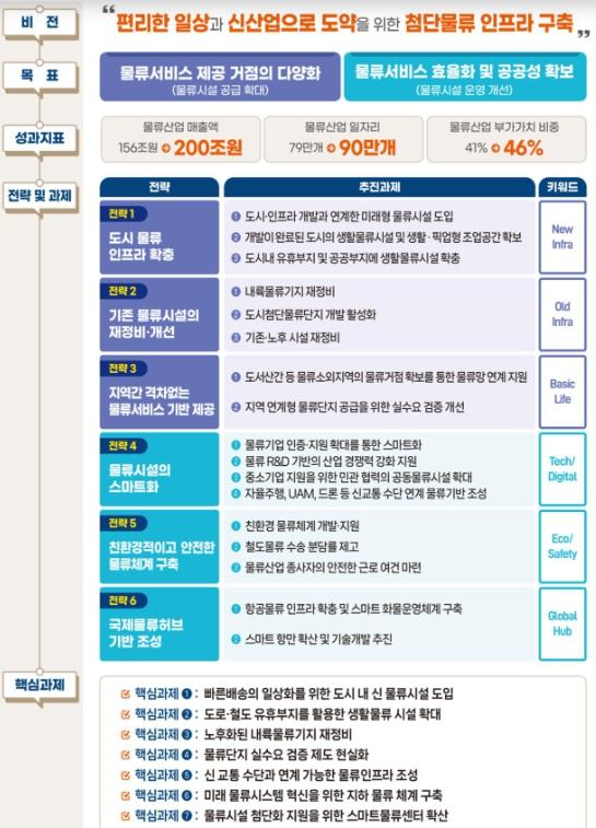 연구개발(R&D)을 통해 생활물류 배송 전 과정을 친환경화?첨단화하고, 자율주행?도심항공교통(UAM)?드론 등 신교통 수단과 연계한 물류인프라 제공 방안도 검토한다.