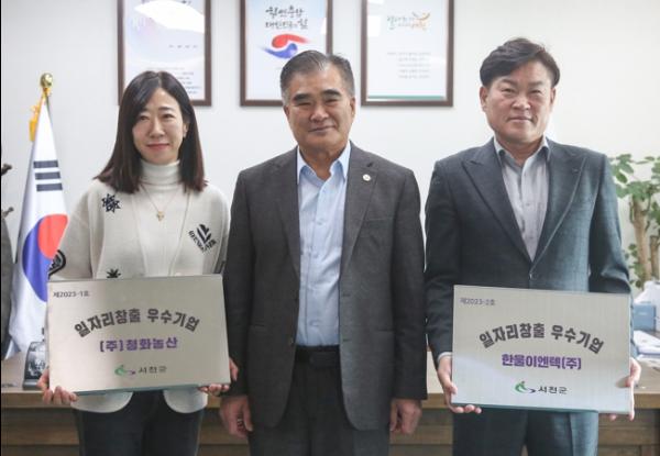 서천군이 27일 고용확대와 일자리 창출에 기여한 관내 2개 기업을 우수기업으로 선정해 인증서와 현판을 수여했다.