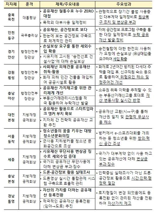 또한, 행정안전부장관상(3건)에는 ▲경기도 안산시 ‘손실보상 요구를 통한 세외수입 확충’, ▲강원도 횡성군 ‘사회재난 피해건물 공유재산 취득·활용’, ▲충청남도 아산시 ‘공유재산 가치제고를 위한 관리체계 개선’ 사례가 선정됐다.