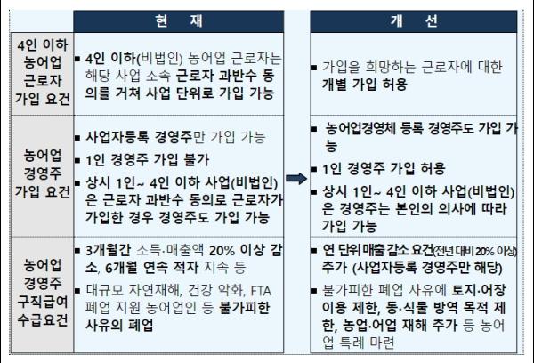 ? 4인 이하(비법인) 농어업 근로자 및 농어업 경영주의 고용보험 가입 선택권 제고, ? 농어업 경영주의 고용보험 가입 요건을 농어업경영체 등록까지 확대, ? 농어업 실태에 맞는 구직급여 수급 요건 정비 등이 주요 내용이다.