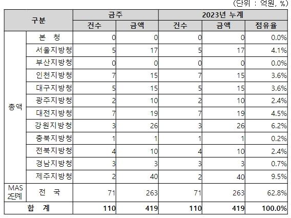 지역별 발주량을 보면, 총액계약 대상 156억 원에 대하여는 서울청 등 10개 지방청에서 각각 집행할 예정이다.