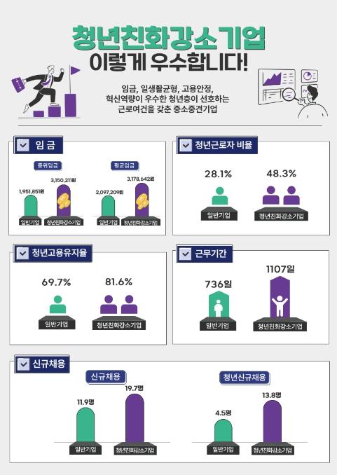 또한, 청년고용유지율은 평균 81.6%로 일반기업(69.7%)보다 11.9%p 높고, 근속기간도 일반기업보다 1년 이상(371일) 더 긴 것으로 나타났다.