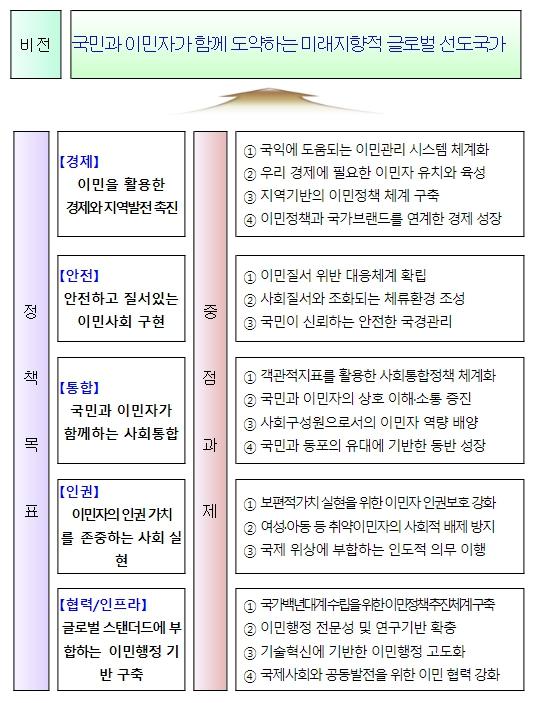 이번 기본계획의 5대 정책 목표는 ?(경제)이민을 활용한 경제와 지역발전 촉진, ?(안전)안전하고 질서있는 사회 구현, ?(통합)국민과 이민자가 함께하는 사회통합, ?(인권)이민자의 인권가치를 존중하는 사회 실현 ?(협력/인프라)글로벌 스탠더드에 부합하는 이민행정 기반 구축이다.