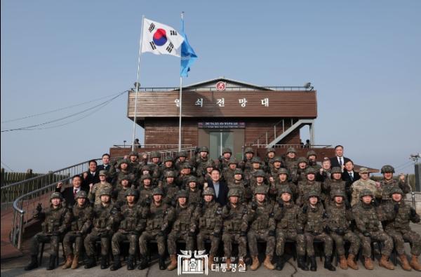 윤석열 대통령은 연말연시를 맞아 12월 28일 오전 중부 전선 육군 제5보병사단을 방문해 군사대비태세를 점검하고, 최전방에서 빈틈없는 경계 작전에 매진하고 있는 장병들의 노고를 치하했다.