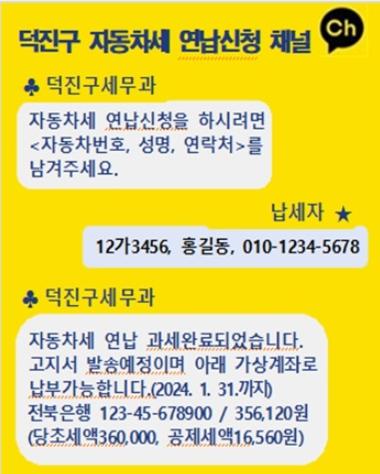 자동차세 연세액 납부 제도는 연 2회(6월, 12월) 납부하는 자동차세를 연납 월(1, 3, 6, 9월)에 납부하면 선납기간에 해당하는 세액의 5%를 공제해 주는 제도로 절세효과가 톡톡하여, 매년 1월이면 업무가 마비될 정도로 연납 신청 전화가 폭주하는 실정으로, 이를 해결하기 위해 덕진구는 카카오톡에 '덕진구 자동차세 연납신청 채널'을 개설하여 운영하기로 했다.