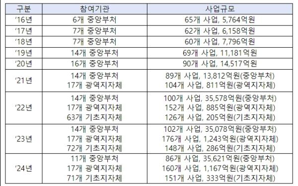 [지자체] 서울시가 강동구, 마포구 등 기초지자체 13개 기관과 함께 33개 사업을 통해 385억원(25.5%)을 지원한다. 그리고 경기도(12개 기관, 41개 사업, 153억원(10.2%)), 경상남도(8개 기관, 30개 사업, 107억원(7.1%)), 부산시(4개 기관, 23개 사업, 106억원(7.0%)), 광주시(4개 기관, 14개 사업, 105억원(7.0%)) 순으로 많은 예산을 투입하여 지원한다.