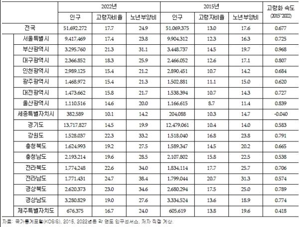 분석 결과 고령화 정도는 인구밀도가 낮은 군 단위 지역이 높으며 노인부양비도 전국 평균보다 높은 것으로 나타났다. 전국의 고령화 속도는 0.677로 최근 7년간 65세 이상 고령자가 차지하는 비중이 연평균 0.7%p씩 증가하는 것으로 나타났다. 부산광역시가 0.968로 가장 빠르게 고령화가 이루어지고 있고, 젊은층의 인구 유입이 지속적으로 이루어지는 세종특별자치시는 ?0.040으로 가장 느리게 진행되는 시도로 나타났다.