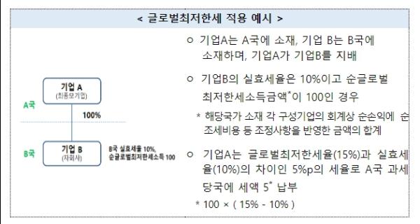 해당 논의는 ?고정사업장이 없어도 다국적 기업의 소득에 대한 과세권을 매출이 발생한 시장 소재국에 재배분하는 ?필라1 어마운트 에이(Amount A)?와 ?특정 국가에서 최저한세율(15%) 보다 낮은 실효세율로 과세되는 경우 다른 국가에 과세권을 부여하는 ?필라2 글로벌최저한세? 등으로 구성되며, ?필라2 글로벌최저한세?는 우리나라를 비롯한 영국, 프랑스, 일본 등 세계 주요국에서 올해부터 시행된다.