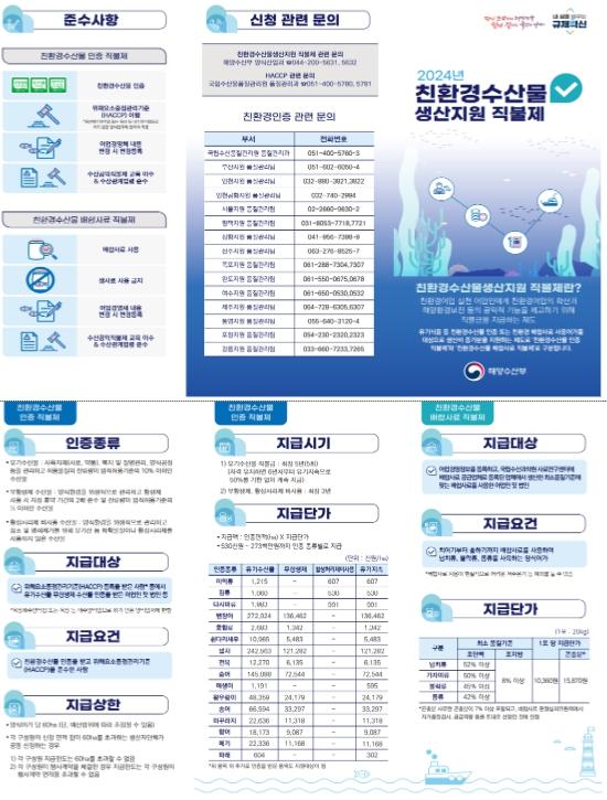 올해는 1월 8일부터 관할 시·군·구를 통해 지원 대상 어가를 모집하며, '인증 직불제' 지원 대상 어가는 2월 29일까지, '배합사료 직불제' 지원 대상 어가는 1월 31일까지 신청하면 된다. 지급요건 등 구체적인 사항은 관할 시?군?구의 수산 관련 부서에서 안내받을 수 있다.