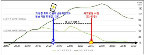 기상청에서 광주·전남 지역에 내린 강수를 분석한 결과, 지난해 6월 27일 22시 40분경 전라남도 함평군 엄다면 인근에서 발생한 60대 여성 실종사건으로부터 약 1시간 10분 전인 21시 28분경, 해당 지역에서 내린 비가 이미 기상청 호우 긴급재난문자(CBS) 발송 기준을 충족하는 수준이었던 것으로 나타났다. 만약 이 제도가 당시 광주·전남에서도 시행됐다면, 40 dB 이상의 경고음을 동반한 긴급재난문자를 통해 위험성을 강하게 경고하고 즉각적인 안전 조치를 유도함으로써 안타까운 인명피해를 예방할 수도 있었을 것이다.