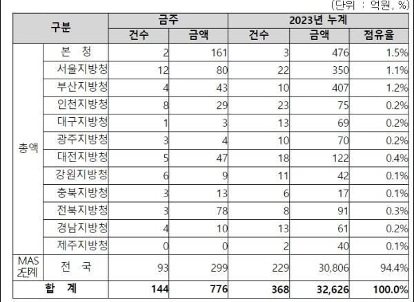 지역별 발주량을 보면, 총액계약 대상 477억 원 중 본청이 161억 원으로 33.8%를 집행하고 서울청 등 11개 지방청에서 316억 원을 각각 집행할 예정이다.