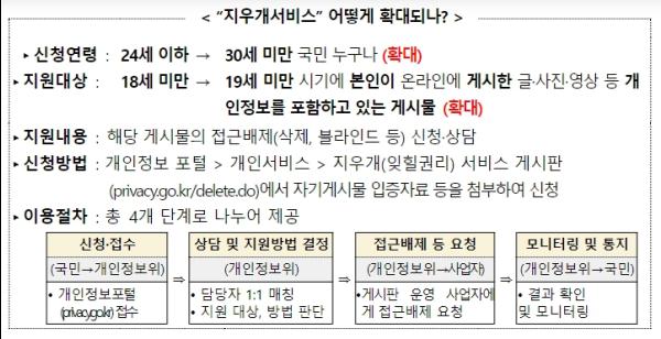 개인정보보호위원회가 작년부터 시범운영하고 있는 “지우개서비스”의 지원 대상을 확대한다. “지우개서비스”는 어릴 적 무심코 올린 개인정보가 포함된 온라인 게시물에 대하여 개인정보위가 삭제, 블라인드 처리 등을 도와주는 서비스다.