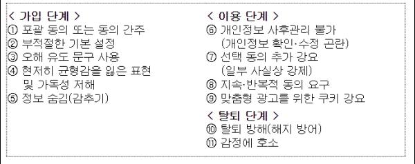 ①개인정보 수집·이용에 대해 별도로 동의받지 않고 개인정보 처리방침, 이용약관 전문으로 동의받거나, ②마케팅 정보 제공, 개인정보 공유와 같은 선택 동의 사항에 대해 사전에 미리 설정해 놓고 이용자가 개인정보 설정 화면에 들어가서 확인해야만 수정할 수 있는 경우, ③가입 시 이용자 본인이 입력한 개인정보에 대한 사후관리가 곤란(개인정보 확인·수정 불가)한 경우 등 이용자의 개인정보 보호와 관련한 11개의 대표적인 눈속임 설계 유형을 발견했다.