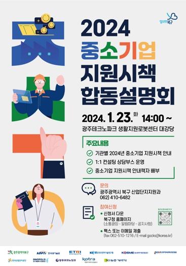 광주시 북구가 오는 23일 오후 2시 광주테크노파크 생활지원로봇센터 대강당에서 12개 협력 기관과 함께 ‘2024년 중소기업 지원시책 합동 설명회’를 개최한다고 밝혔다.