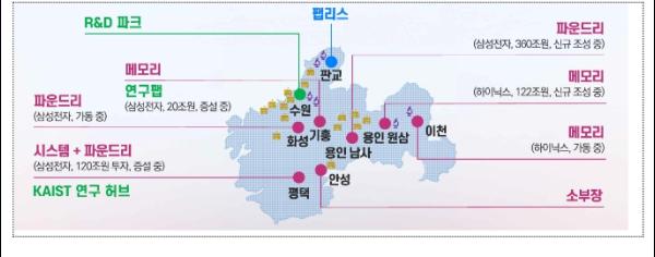 반도체 메가 클러스터는 경기 평택 · 화성 · 용인 · 이천 · 안성 · 성남 판교 · 수원 등 경기 남부의 반도체 기업과 관련 기관이 밀집한 지역 일대를 의미한다. 현재 19개의 생산팹과 2개의 연구팹이 집적된 메가 클러스터에는 ’47년까지 총 622조원의 민간 투자를 통한 총 16개(생산팹 13개, 연구팹 3개)의 신규팹이 신설될 예정이며, 특히 ’27년에는 생산팹 3기, 연구팹 2기가 완공될 전망이다. 메가 클러스터는 2,102만m2 면적에 ’30년 기준 월 770만장의 웨이퍼를 생산하는 것으로 예상되는 등 세계 최대 규모이다. 정부와 기업은 연관 소재·부품·장비 기업, 공공 반도체 연구소, 팹리스, 인재를 양성하는 다수의 대학들이 위치한 메가 클러스터에 HBM 등 최첨단의 메모리 생산과 2nm 이하 공정 기반 시스템반도체 생태계를 조성하여 세계 최고의 반도체 생산기지를 조성한다.