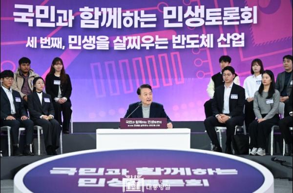 윤석열 대통령은 1월 15일 오전 대표적인 반도체 인력양성 교육기관 중 하나인 경기도 수원시 소재 성균관대학교 자연과학캠퍼스 반도체관에서 ‘민생을 살찌우는 반도체 산업’을 주제로 세 번째 ?국민과 함께하는 민생토론회?를 개최했다. 이번 토론회는 경제정책 방향(1/4, 목), 주택(1/10, 수)에 이어 반도체 메가 클러스터 조성방안에 대해 기업과 지역주민, 학생 등 국민의 목소리를 생생하게 듣고 관계 부처가 칸막이 없이 한 자리에 모여 문제 해결 방안을 찾기 위해 마련됐다.