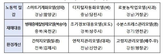 전북 김제 밀·콩 재배지에는 ‘간척지관리모델’을 구축한다. 간척지 토양의 양분과 수분 함량 제어를 위한 자동 감지기(센서) 기술 및 무굴착 땅속 기술이 적용되고, 농작업 로봇·자율주행 기술 등도 투입한다.
