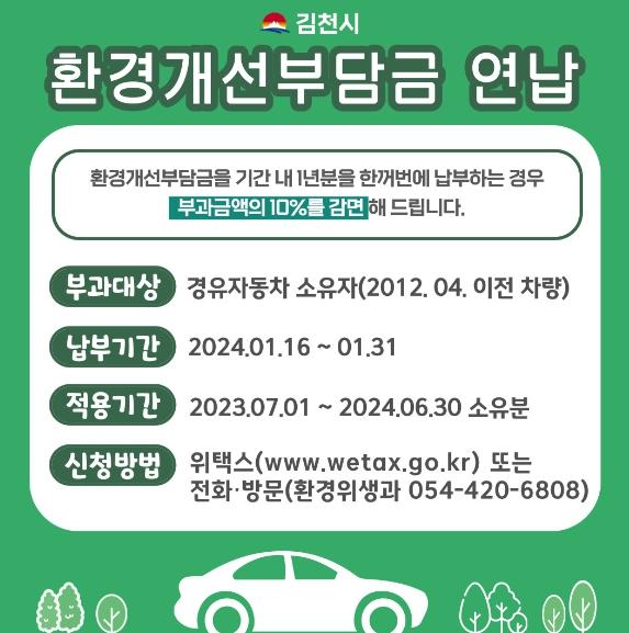 김천시는 환경개선부담금 부과 대상 경유 자동차를 소유한 자를 대상으로 2024년 1월 16일부터 31일까지 환경개선부담금 일시 납부(연납) 신청받는다.