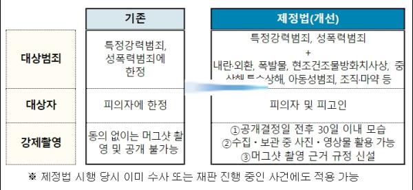 기존에는 특정강력범죄와 성폭력범죄의 피의자에 한정하여 신상정보 공개가 가능하고, 피의자의 동의 없이는 ‘머그샷’ 촬영이나 공개가 어려웠으나, ?중대범죄신상공개법?이 시행되면 내란?외환, 폭발물사용, 현주건조물방화치사상, 중상해?특수상해, 아동대상성범죄, 조직?마약범죄가 추가되고, 재판 단계에서 공개 대상 범죄로 공소장이 변경된 경우에는 피고인에 대해서도 신상정보 공개가 가능해진다.