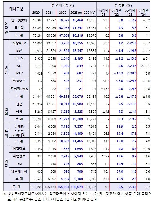 과학기술정보통신부와 한국방송광고진흥공사(KOBACO)는 2022년도 국내 방송통신 광고비 시장 현황과 2023~ 2024년 전망을 담은 ?2023 방송통신광고비 조사? 결과를 발표했다.
