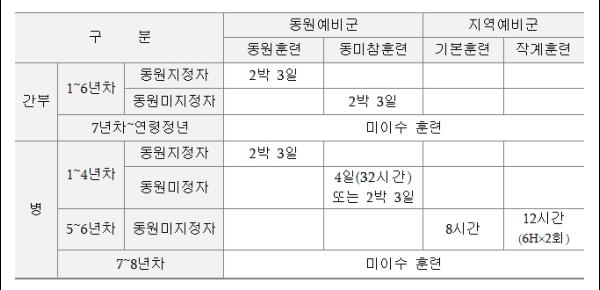5~6년차 예비군들 대상으로는 핵ㆍ화생방 위협 대응능력과 관련한 훈련과제를 기본훈련(출ㆍ퇴근식훈련)에 반영하고, 민ㆍ관ㆍ군ㆍ경 통합방위작전 수행능력을 향상하기 위해 화랑훈련 등과 연계하여 작계훈련을 진행한다.