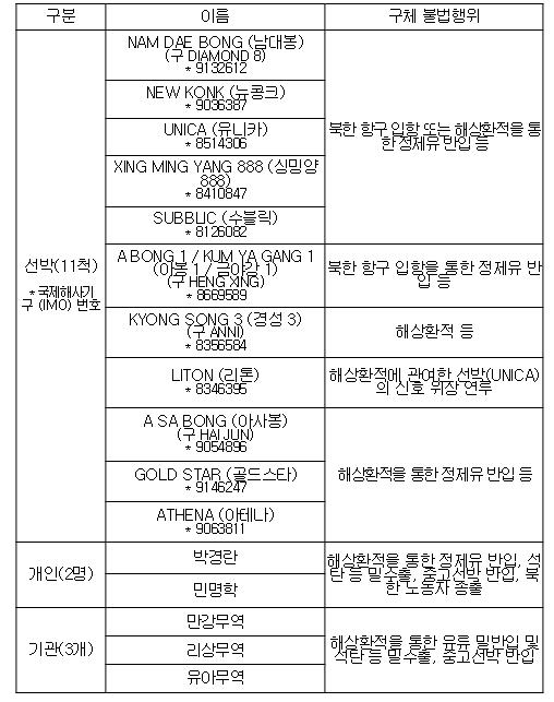 북한은 해상에서 선박 간 유류 환적, 석탄 밀수출 등 유엔 안보리 제재를 회피하는 다양한 불법행위를 통해 유류를 비롯한 물자와 자금을 조달하여 핵·미사일을 개발해왔다. 우리 정부는 이에 대응하는 차원에서 1월 17일 해상환적, 대북 유류 반입 및 밀수출 등에 관여함으로써 북한의 핵·미사일 개발을 지원한 선박 11척, 개인 2명 및 기관 3개를 대북 독자제재 대상으로 지정하였다.