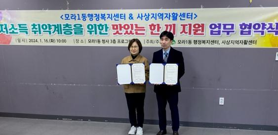 사상구 모라1동은 지난 16일 사상지역자활센터와 관내 저소득 취약계층을 위한‘맛있는 한 끼 식사지원’업무협약을 체결했다.