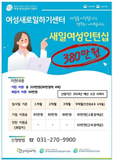 새일센터 사업을 수행 중인 경기북부광역새일센터와 경기북부새일센터는 2024년도 예산 소진 시까지 새일여성인턴제 사업에 참여 희망하는 기업과 참여자를 모집한다.